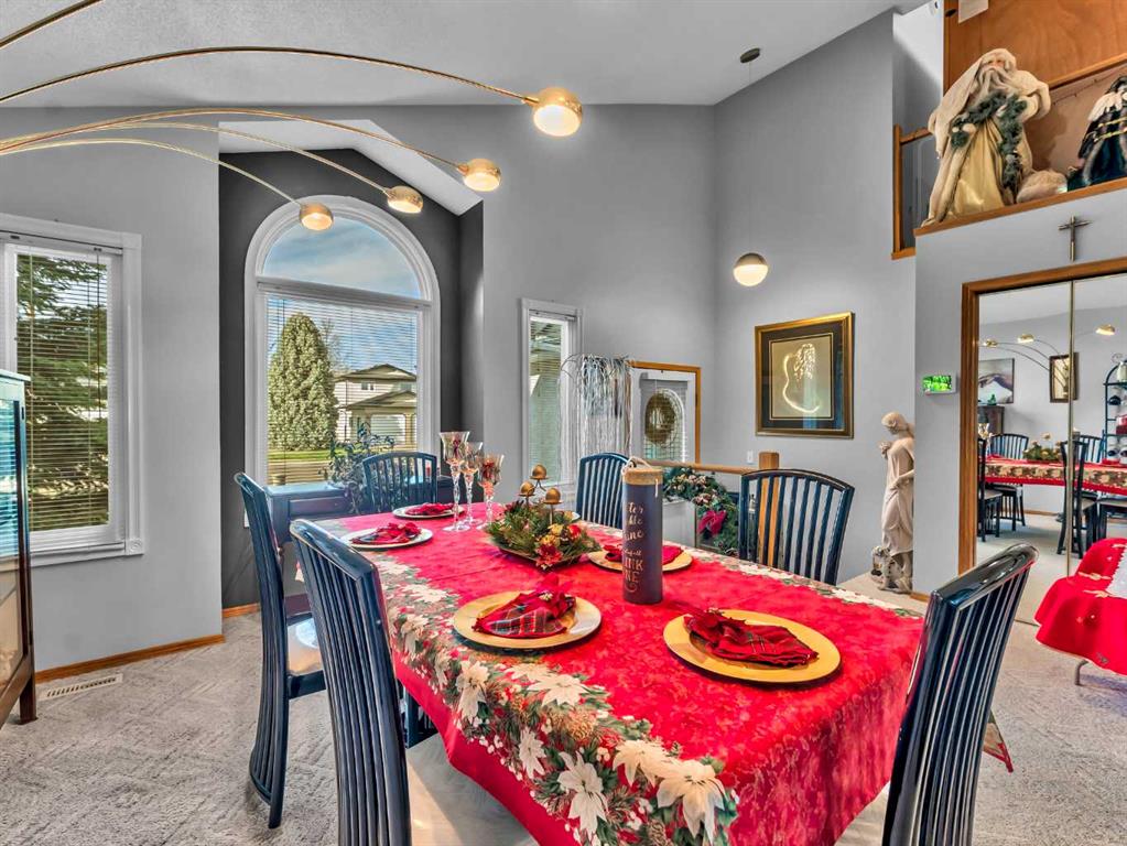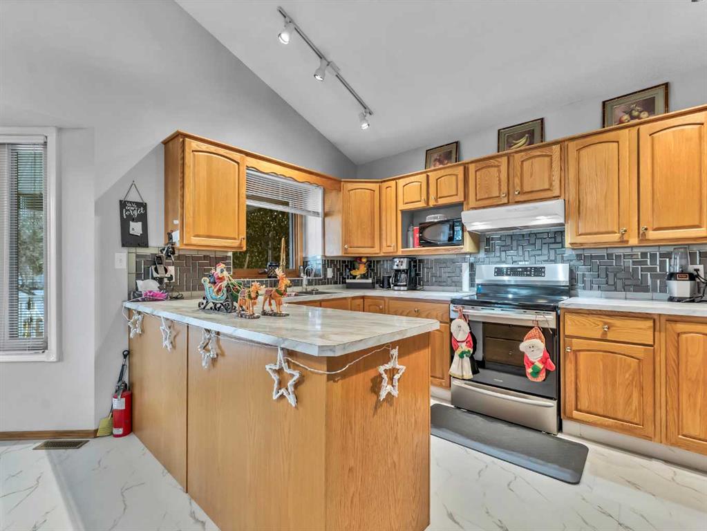 Located in the highly sought-after Parkview neighbourhood, just one minute from the Medicine Hat Golf & Country Club, this well-maintained two-storey split home offers space, flexibility, and a long list of updates. Featuring 3 bedrooms and 3.5 bathrooms, this property is ideal for families looking for a comfortable home in an established location. The main floor welcomes you with a front flex room currently used as a formal dining area, but easily suited for a living room, home office, or play space. The kitchen offers ample oak cabinetry, updated countertops and backsplash, newer appliances, and a spacious dining area with direct access to the back deck and yard. From here, the layout flows into the large sunken living room, highlighted by a cozy gas fireplace. A convenient 2-piece powder room and main-floor laundry are located just off the attached double garage. Upstairs, you’ll find three bedrooms, including the primary suite featuring a walk-in closet and a private updated 3-piece ensuite with a newer air-jetted tub. A full updated 3-piece bathroom with a newer large spa-style shower completes the upper level. The lower level provides a generous family room, an updated 3-piece bathroom, and a huge storage room, offering plenty of space for recreation and organization. Outside, the fully fenced and landscaped backyard is a standout feature. Enjoy the new, oversized two-tier covered deck, underground sprinklers, RV parking, and an abundance of mature fruit including plum and apple trees, raspberry and blueberry bushes. Two sheds provide additional storage. Notable updates include a new roof (4–5 years), windows (6 years), A/C and furnace (6 years), hot water tank (2024), updated kitchen finishes and appliances, renovated bathrooms, and the new deck. A wonderful opportunity to own a move-in ready home in one of Medicine Hat’s most desirable neighbourhoods.